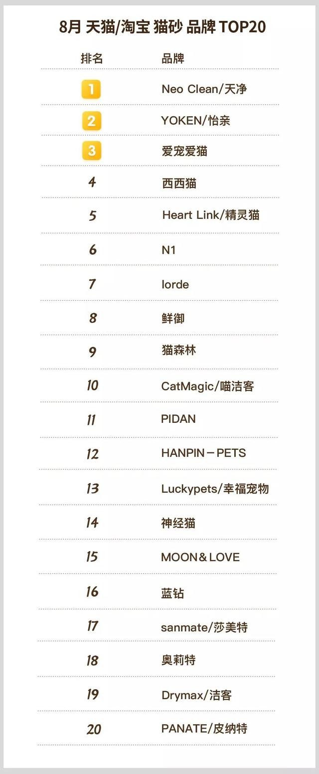 猫砂榜单第一依旧为Neo Clean/天净,较7月相比, YOKEN/怡亲与爱宠爱猫出现了换位的情况,YOKEN/怡亲位居第二、爱宠爱猫位居第三; sanmate/莎美特连续上升10名,PANATE/皮纳特上升14名,挤进TOP20榜单,位居第十七、第二十,表现极为强劲;HANPIN-PETS、MOON&LOVE则表现相反,HANPIN-PETS下滑3名,MOON&LOVE下滑5名,位居第十二、十五。