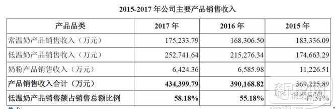 公司低温奶产品销售量占乳制品销售总量比例较高,为公司把握低温奶的良好增长前景奠定了坚实的基础。2015-2017 年,公司低温奶产品销售额占销售总额比例不断提高,从2015 年的47.31%提升至2017 年的58.18%,逐渐确立其在公司各产品类别中的主导地位,符合行业的发展趋势。