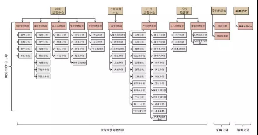 从左到右:采用“直营连锁宠物医院+采购公司+培训公司”的组织结构