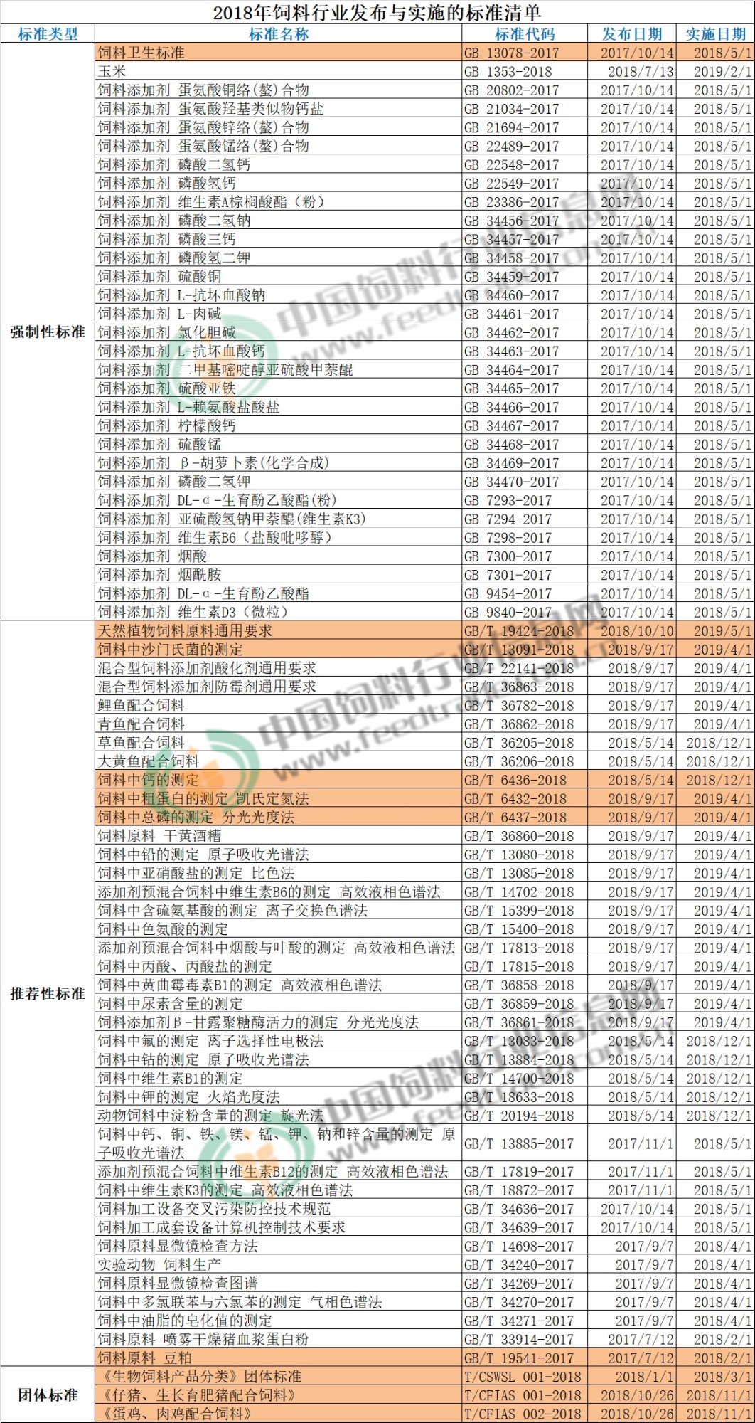 中国饲料工业协会2018年10月26日发布、2018年11月1日实施的《仔猪、生长育肥猪配合饲料》和《蛋鸡、肉鸡配合饲料》;