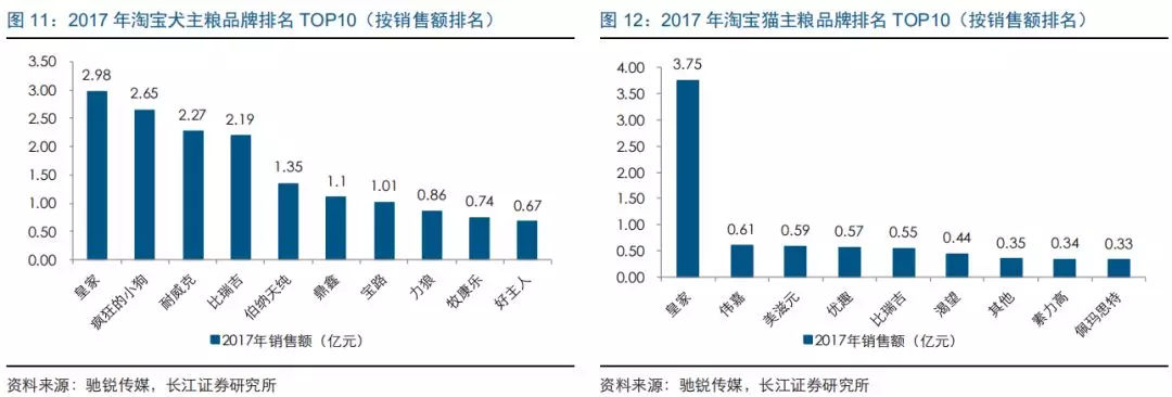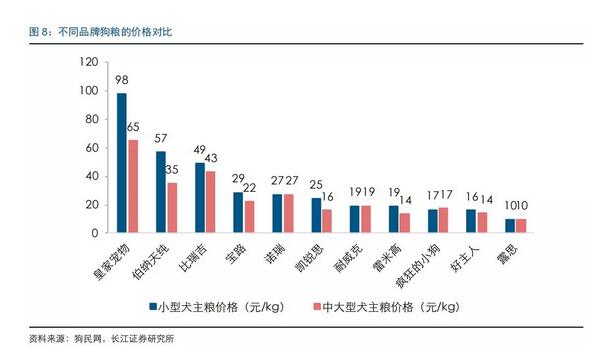 在竞争激烈的主粮市场,国产品牌通过电商渠道开始寻求突围,并已经占据一席之地。以疯狂的小狗为代表的国产品牌率先从电商渠道开始发力,公司以互联网技术为依托,利用B2C平台实行线上销售,凭借着体贴的购物向导和专业的客服,以货正价优的服务宗旨,一直为宠友们提供最优质的网络购物体验,短短三年时间,公司在淘宝上的销售额成功跻身第二名。宠物主粮品牌众多,2017年中国宠物主粮品牌有400多个,不同品牌定价存在较大差异,市场竞争激烈,对于国产品牌而言,需要不断提升宠物主粮的产品品质,努力通过电商渠道来提升自己的品牌影响力。