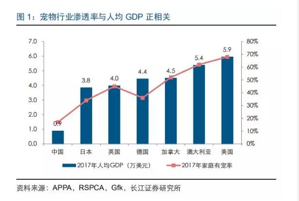 长江证券表示,随着人均GDP的不断提高,中国家庭的养宠比例也开始持续提升。欧美主要发达国家的家庭养宠比例基本都在50%以上,而中国一线城市的人均GDP已经开始接近发达经济体。