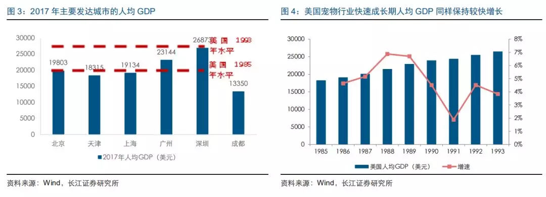 国内的宠物产业呈点状分布,主要分布在北上广深、成都、杭州和南京等一二线城市,一线城市2017年人均名义GDP接近美国90年代初的水平,这一时期也是美国宠物产业快速成长期,宠物数量的增长带动了宠物食品消费,以宠物用品店和小型零售店为主的宠物终端零售渠道快速发展,这与现阶段中国一二线城市宠物行业的发展情况有些类似。