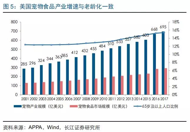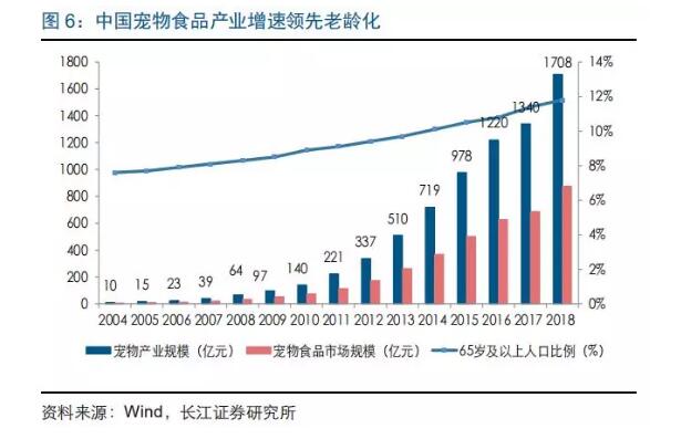 宠物行业规模与人口老龄化密切相关,老龄化程度的提升将进一步促进宠物产业的发展。对比中美宠物市场规模与老龄化关系的图像可以看出,虽然两国的宠物食品和整体宠物产业规模都与老龄化程度成正向关系,但美国2001年以来,宠物产业与宠物食品市场的年复合增速在4%左右,和老龄化增速(1.5%)相差不大。而在中国,自2004年开始宠物产业的年均复合增速在40%左右,远快于老龄化增速的3.2%。这说明我国的宠物食品市场仍然处于发展的初期阶段,宠物主粮市场还处于导入期。