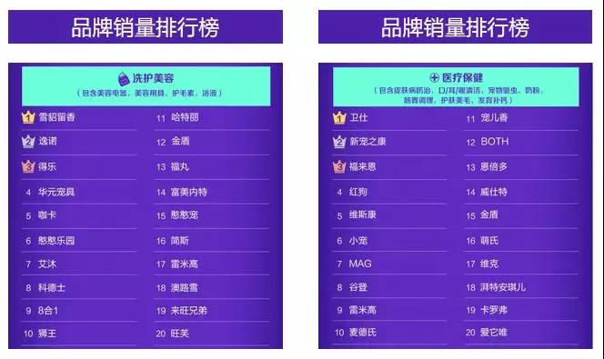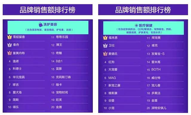 在洗护美容上,雪貂留香成为2018年洗护美容类目在销量和销售额上均拿下第一的品牌,春舟和富美内特位列二三名;在医疗保健类目上,福来恩、卫仕、麦德氏、红狗、大宠爱占据前五。