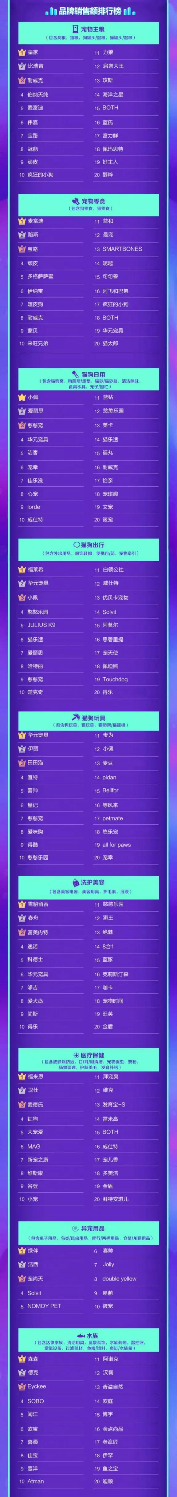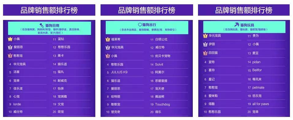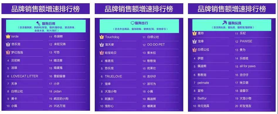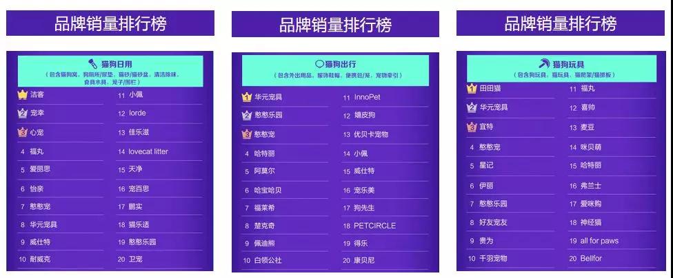 在猫狗日用、猫狗出行、猫狗玩具三大榜单上,分别有洁客、华元宠具、田田猫摘得销量榜桂冠;