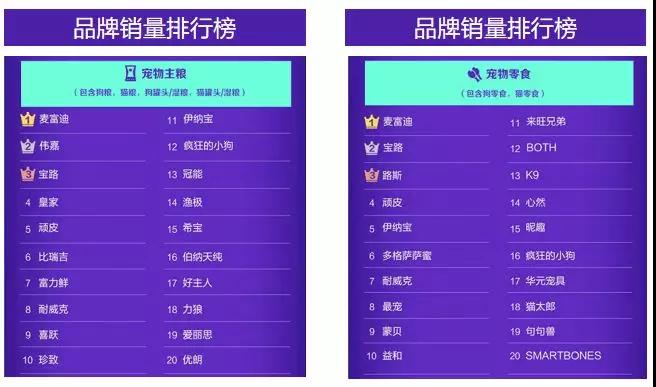 宠物品牌销量排行榜:麦富迪拿下主粮零食销量双冠;