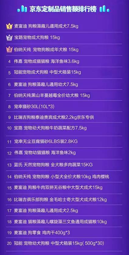 最后,京东超市还公布了一份“京东定制榜单TOP20”,其中麦富迪6款主粮或零食上榜,伯纳天纯3款狗粮上榜,宠幸2款猫砂上榜,比瑞吉2款狗粮上榜,此外,宝路、伟嘉、冠能、蓝氏也有联名产品上榜。