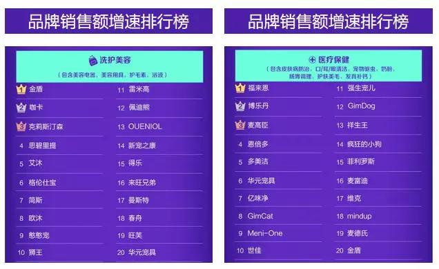 在洗护美容类目销售额增速上,金盾、咖卡、克莉斯汀森分获前三;医疗保健类目上,福来恩、博乐丹、麦高臣占据了医疗保健类目销售额增速的前三名。