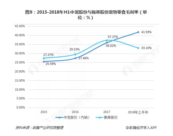 中宠股份与佩蒂股份是两家国内宠物行业上市的A股公司,前者经营十余个系列的各类宠物食品,后者主营宠物零食,包括畜皮咬胶、植物咬胶和部分营养肉质零食。佩蒂股份的咬胶产品更新换代较快,其中植物咬胶毛利率高于传统畜皮咬胶毛利率(2018年上半年,植物咬胶毛利率33.49%,畜皮咬胶毛利率37.05%)公司整体毛利率呈现稳中有升态势。受原材料价格影响,中宠股份的内销毛利率高于外销,2018年中宠股份加大研发投入,毛利率在上半年一度超过佩蒂股份。