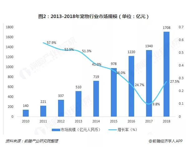 2010-2017年,国内宠物市场规模年复合增长率达到30%。2018年我国宠物行业市场规模已突破1700亿元,同比增长27.5%,远超2017年白皮书预期,其中犬类消费规模实现1056亿元,猫类消费规模652亿元。可见我国宠物产业仍处于蓬勃发展期,潜力大,增速快。