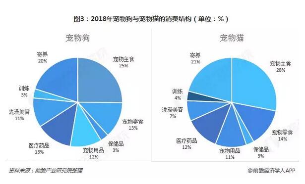 从宠物行业的消费类别来看,宠物狗、猫的消费结构非常类似,消费品前三名均为主食、寄养和零食。主食、零食和保健品属于宠物食品领域,其中零食作为消费升级的产物,在宠物狗、猫的消费品中占比分别为13%和14%。