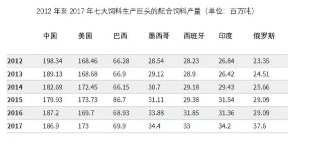 七个国家在世界上被称为最大的配合饲料生产国,它们分别是中国、美国、巴西、俄罗斯、墨西哥、印度和西班牙。这七个在饲料生产量上名列前茅的国家可以被视为农业生产发展趋势中的一个晴雨表。2017年的最新统计数据显示,在这七个国家中,除了中国之外的其他六个国家都增加了它们的饲料年生产量。中国是近几年里饲料企业合并数量最大的国家之一,其动物蛋白需求量正在衰减,同时预测到人口增长率将会下降。2012年至2017年,全球七大饲料生产巨头的配合饲料生产量统计数据由下表可见。