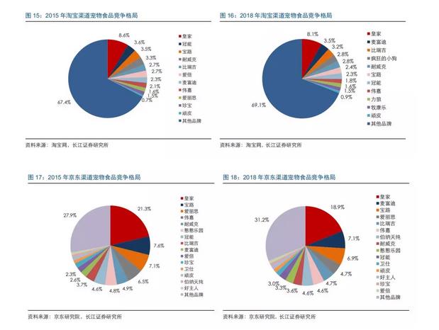长江证券因此认为,从目前宠物食品市场的主要品牌来看,皇家是具有强产品力的代表。为此,其分析了皇家宠物食品在2015年和2018年淘宝、京东渠道宠物食品竞争格局发现: