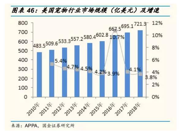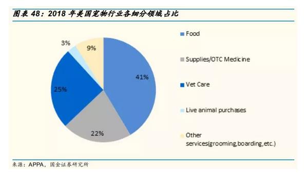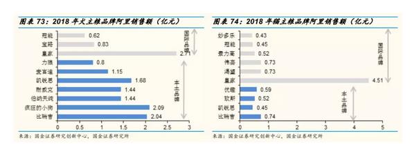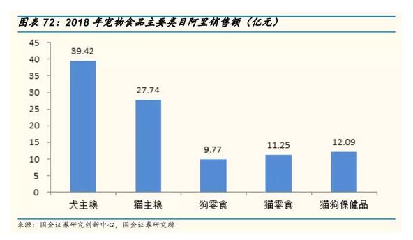 根据国金证券跟踪的阿里(天猫+淘宝)销售数据,2018年犬主粮、猫主粮、狗零食、猫零食和猫狗保健品在阿里全网的销售额分别为39.42亿元、27.74亿元、9.77亿元、11.25亿元和12.09亿元。主食依旧是线上销售的主力品类,但是零食和保健品的销售势头也日益迅猛。