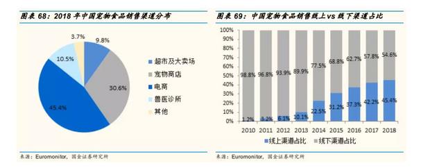 国金证券指出,从渠道分布来看,电商和宠物商店已经成为中国宠物食品销售占比最大的两个渠道。
