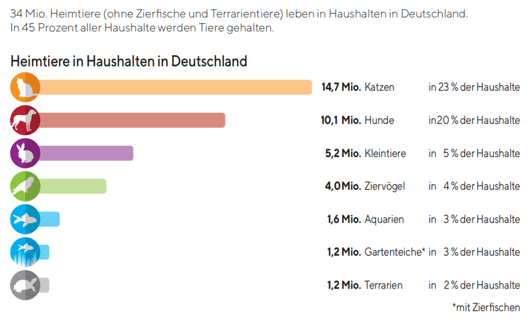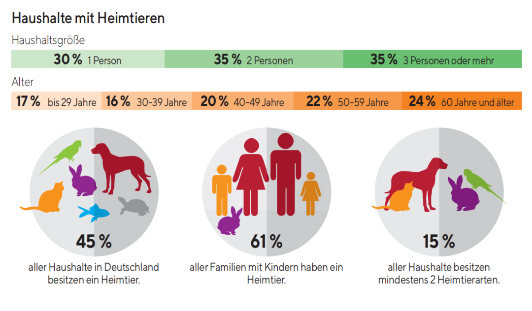 有45%的德国家庭在养宠宠物,其中在有小孩的家庭中,有61%养宠物。大多数宠物生活在多人家庭中,两人、三人或三人以上家庭的养宠比例为35%,而单身家庭的养宠比例为33%。