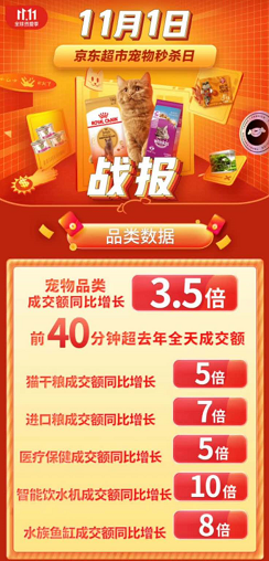 京东发布11.11首日战报。战报显示,宠物品类是今年双11首日交易额增速TOP 5品类之一,同比增长超3.5倍。据悉,前40分钟的销售额就已超过了去年全天的成交额。