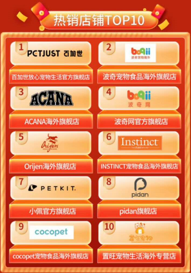 在热销店铺TOP 10中,排在首位的是百加世放心宠物生活官方旗舰店,而波奇宠物食品海外旗舰店和波奇网官方旗舰店则分别位列第二和第四位,排在第三的则是ACANA海外旗舰店。