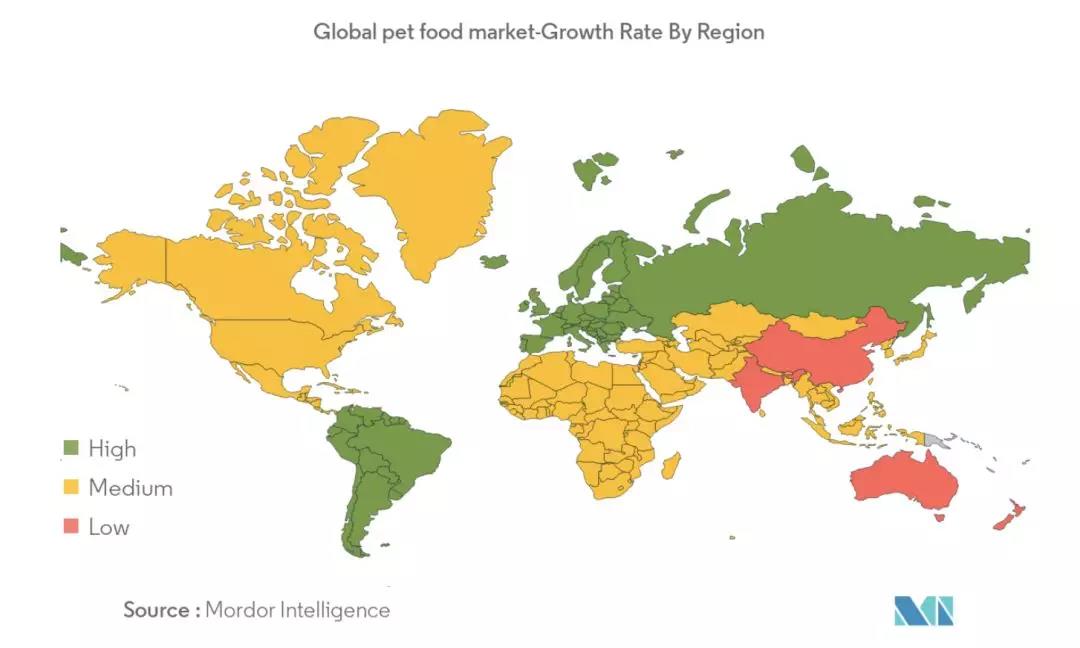 2018年全球宠物食品市场总价值为870.8亿美元,预计在预测期内复合年增长率为5.4%。2019年,北美是研究市场中最大的地理区域,占整个市场的约39.2%。