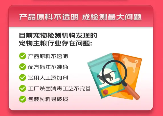 此外,滥用人工添加剂、工厂杀菌消毒工艺不完善、包装材料易破损也是宠物主粮行业亟须解决的问题。