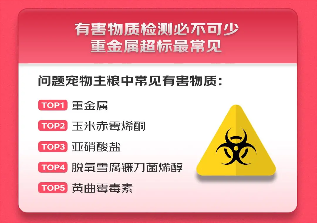 对于其他有害物质,重金属在问题宠粮中最常见,玉米赤霉烯酮、亚硝酸盐、脱氧雪腐