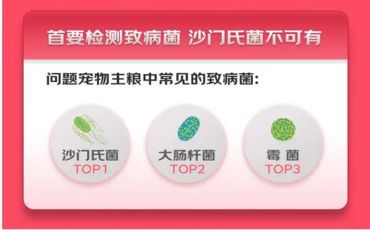 要保证宠物主粮的安全性,致病菌和其他有害物质是必须检测的项目。报告显示,问题宠物主粮中常见的致病菌包括沙门氏菌、大肠杆菌和霉菌。尤其是沙门氏菌,国家标准《GBT 31216-2014 全价宠物食品 犬粮》和《GBT 31217-2014 全价宠物食品 猫粮》均规定不得检出沙门氏菌。