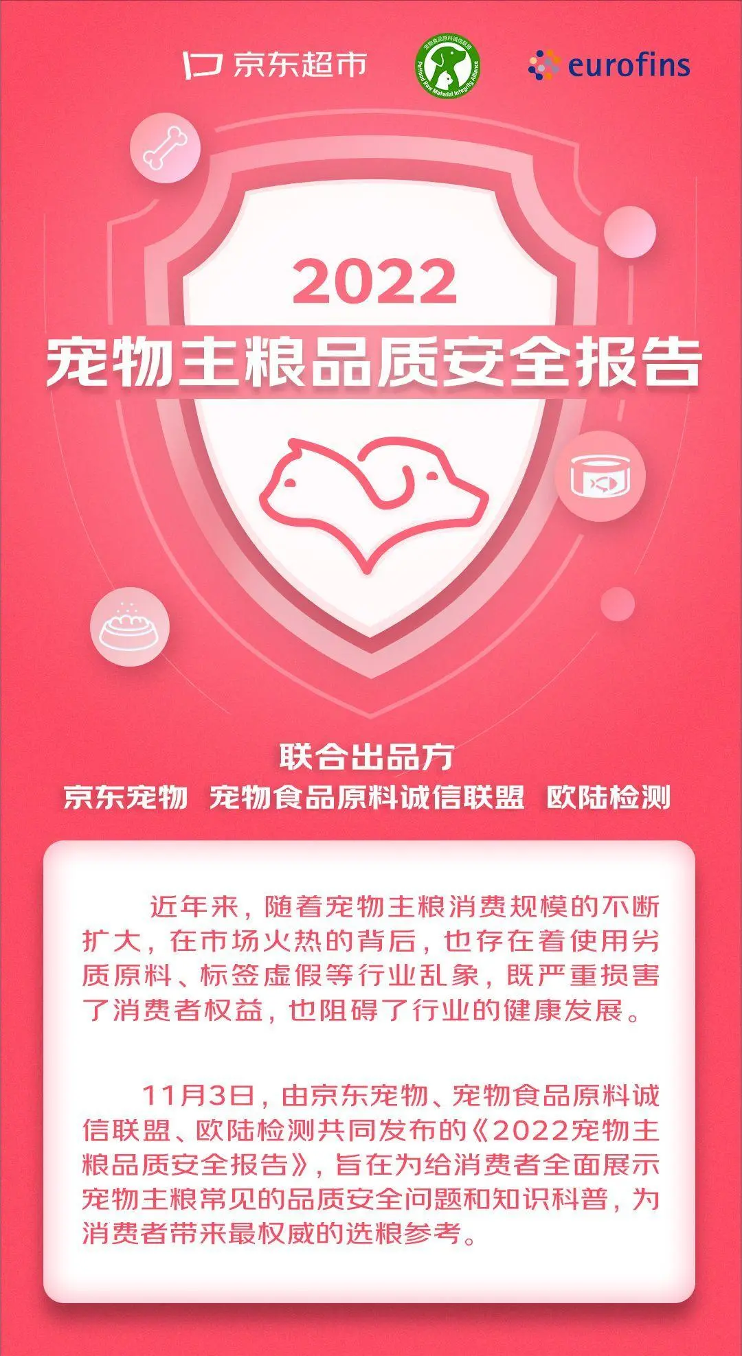 11月3日,京东宠物、宠物食品原料诚信联盟和欧陆检测联合发布《2022宠物主粮品质安全报告》。报告显示,产品原料不透明、配方标注不准确、滥用人工添加剂、工厂杀菌消毒工艺不完善、包装材料易破损是目前宠物主粮行业亟须解决的5大品质安全问题。