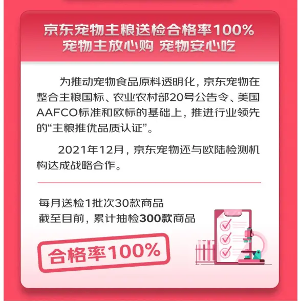为进一步严格落实高于行业标准的品控举措,2021年12月,京东宠物与欧陆检测机构达成战略合作,并率先推进行业领先的“品质推优”品控管理办法。报告显示,京东宠物每月向欧陆检测送检1批次宠物主粮,每批次30款商品,截至目前已抽检300款商品,合格率为100%。