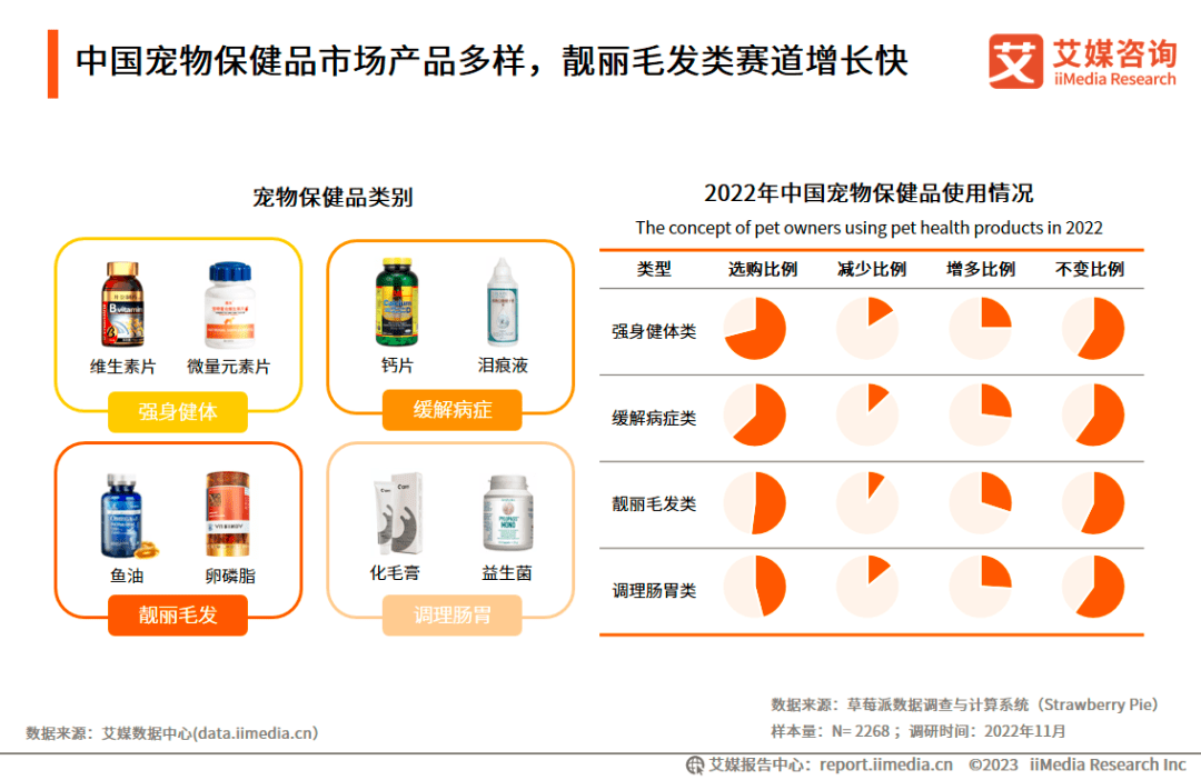 2022年,靓丽毛发类赛道增长较快。数据显示,宠主使用强身健体类产品比例为71%,缓解病症类产品比例为63%,靓丽毛发类产品比例为52%,调理肠胃类比例为46%。