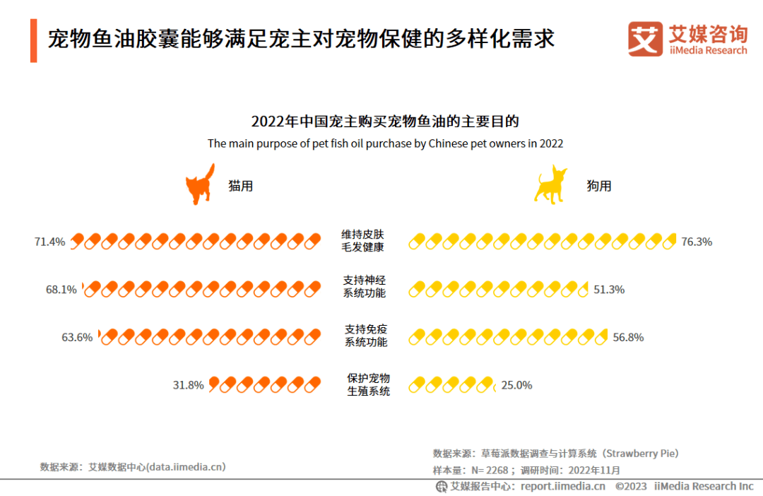 目前市面上主要售卖的宠物胶囊分为猫用型和狗用型两类,数据显示,宠主购买鱼油胶囊的首要目的是维持宠物皮肤、毛发健康,猫用占到71.4%,狗用占到76.3%;其次支持神经系统功能、支持免疫系统功能也是宠主购买宠物鱼油胶囊的主要需求。艾媒咨询分析师认为,宠物鱼油胶囊功能多样,能够满足宠主对宠物保健的多样化需求。