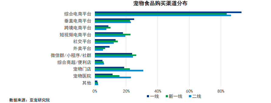 宠物门店、宠物医院是主要线下购买渠道,更受二线城市宠物主欢迎;