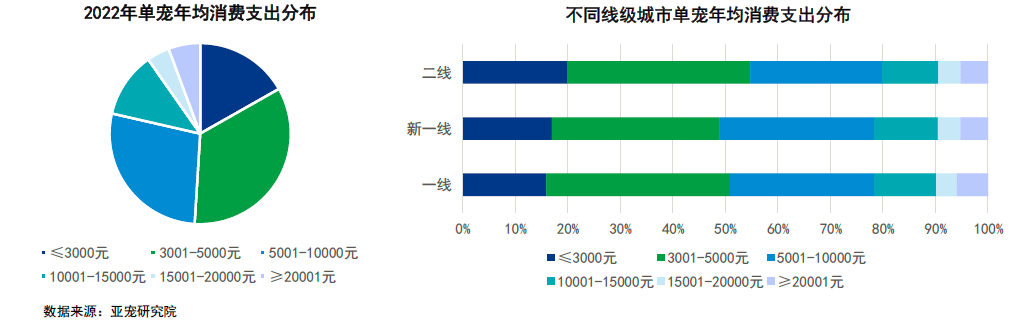单宠年均消费支出集中在3001-10000元,二线普遍在5000元及以下