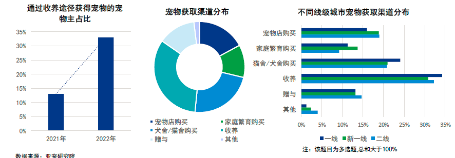 随着“领养代替购买”深入人心,与2021年统计结果相比通过收养获取宠物的比例大幅度增长占比33%。
