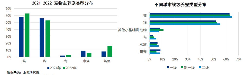 与2021年相比,二线及以上城市养猫的宠物主占比由58%升至63%,养狗占比则下降至53%,养宠偏向的改变将利好猫经