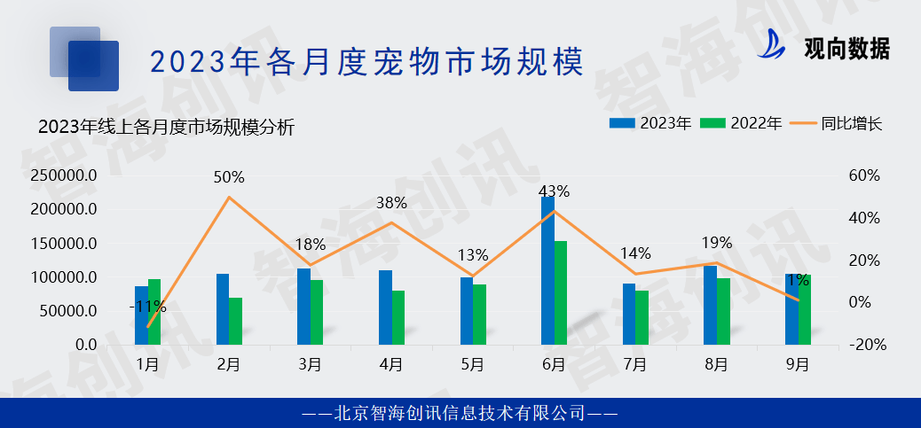 据数据显示,2023年1~9月,某一线上平台的宠物市场规模已经达到105亿元,同比增长20.6%。其中,6月份的销量最高,同比增长43%。