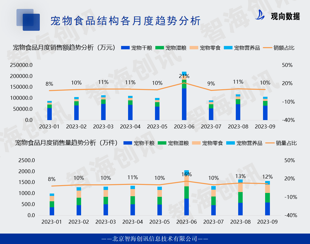 据统计数据显示,2023年1~9月,宠物食品结构市场趋势分析,销售最高的为6月销售额占比21%,销售量占比16%。从数据上来看,每个月的销售相对均衡,这表明宠物食品市场的销售呈现出了稳定的态势。这种持续的销售趋势可能由多种原因所引起。首先,宠物食品是宠物主人们的必备品,而随着人们对宠物健康和福利的关注度不断提高,他们更愿意投入资金购买高质量的宠物食品,从而推动了市场的稳定增长。