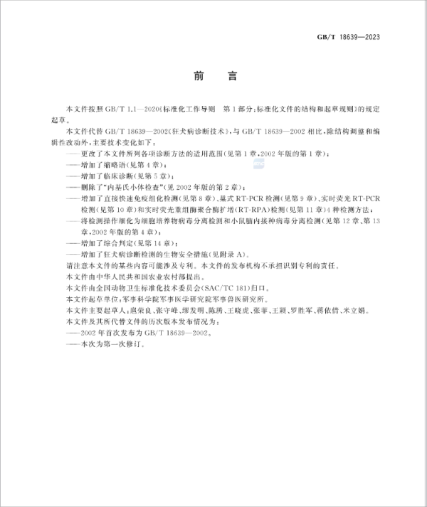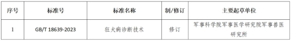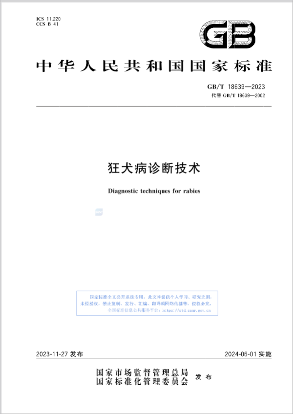 根据国家标准化管理委员会2023年第13号公告,由我标委会归口管理的《狂犬病诊断技术》国家标准于2023年11月27日发布,于2024年6月1日正式实施。