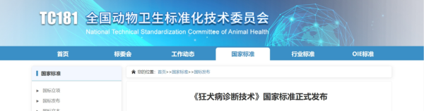 国家标准《狂犬病诊断技术》 由TC181(全国动物卫生标准化技术委员会)归口 ,主管部门为农业农村部。