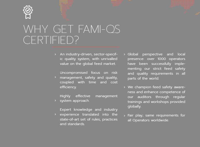 FAMI-QS is a preeminent global Quality and Feed Safety Management System for the sector of Specialty Feed Ingredients.