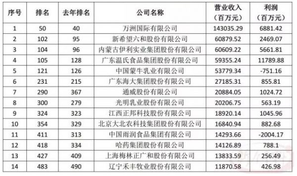 今年上榜的农牧企业有10家,包括万洲国际有限公司、新希望六和股份有限公司、广东温氏食品集团股份有限公司、广东海大集团股份有限公司、江西正邦科技股份有限公司、中国雨润食品集团有限公司、北京大北农科技集团股份有限公司、上海梅林正广和股份有限公司、通威股份有限公司、辽宁禾丰牧业股份有限公司。