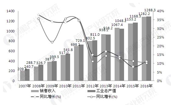 2007-2016年中国兽药行业产销规模走势图(单位:亿元,%)