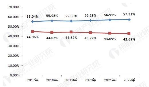 2017-2022年中国兽药细分产品比重变化情况(单位:%)