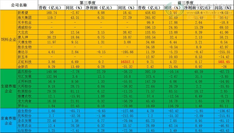 但是今年前三季度的净利润同比几乎全部下跌,上涨的只有以饲料业务为主的企业(如下图所示)。