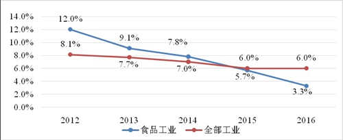 2012-2016年食品工业增加值与全部工业增加值增速图,食品工业总量规模不断扩大。