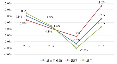 2013—2016年食品工业进出口贸易额增速图,2016年食品进出口总额突破万亿人民币,达到10633.9亿元,食品行业一直呈现进出口贸易逆差的状态,但近两年食品出口总额的增长幅度明显高于进口。