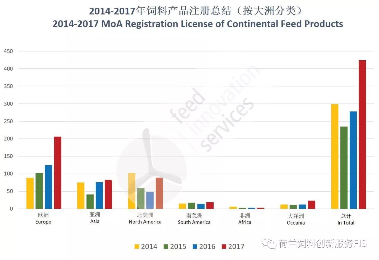 2014-2017年世界各大洲的国家都注册了多少饲料产品?