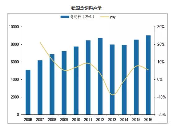 禽类在我国养殖业中属于高度工业化的品种,工业饲料普及率高达90%,因此禽饲料产量占我国饲料总产量的40%以上,在所有饲料品种中位居首位。2016年禽类饲料产量为9016万吨,同比增长5.64%。2017年上半年,受禽流感的影响,下游养殖对饲料的需求量大幅减少,但是2017年下半年饲料销量快速恢复,预计2018年禽饲料仍将在我国饲料产量中占比超过40%。