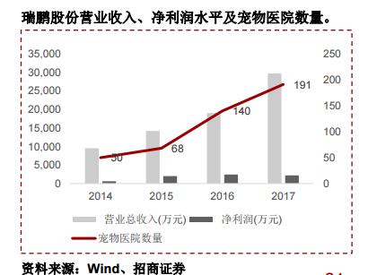 宠物医疗:行业空间较大,竞争格局分散。 2015年,我国宠物医疗行业规模约为328亿元,但行业竞争态势尚不明朗。据不 完全统计,我国宠物医院保有量超过10,000多家,固定资产在1,000万元以下的 中小型医院占比达到90%左右;当前行业龙头为瑞鹏股份,门店数量超过200家,2017年营业收入2.9亿元,收 入市占率不足2%。