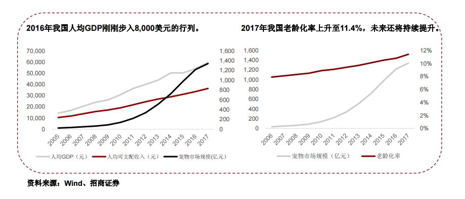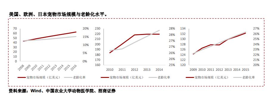 宠物产业的发展与一国老龄化水平呈现较强的正相关关系。